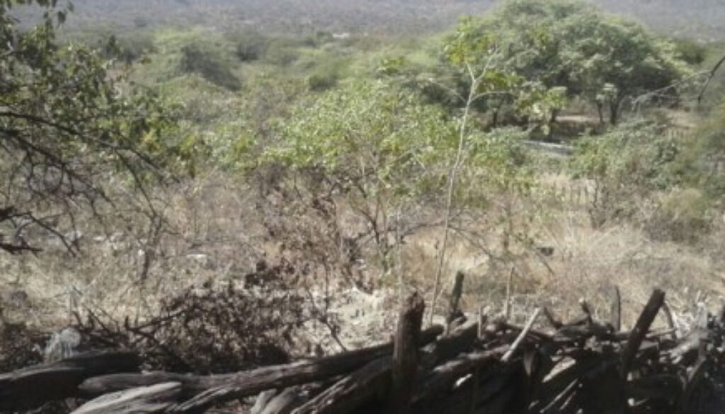 Huerta con arboles frutales, jardines, zonas de estacionamiento.